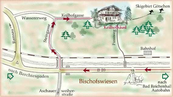Nach der Ortschaft Bischofswiesen, gegenüber der Auffahrt zum Aschauerweiher, rechts über eine kleine Brücke abbiegen, über das Bahngleis dem Straßenverlauf der Steingasse folgen, am Ende der Straße rechts in die Keilhofgasse abbiegen.